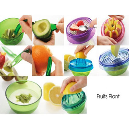 گلدان جادویی Fruits Plant یک محصول بسیار کابردی است که دارای طراحی عالی و هوشمندانه ای می باشد. این محصول 10 کابرد مختلف دارد که از کاربرد های آن می توان به: آبگیر لیمو، قاچ کن سیب، صفحه برش توری، رنده توری شکل، آبگیر گریپ‌فروت و ... اشاره کرد. جالب است بدانید برگ های این گلدان هم کاربرد های مختلف دارد! 2 برگ برای برش لیمو و 4 برگ کوچک بعنوان چنگال طراحی شده اند. این گلدان هم یک دکوری فانتزی و شیک برای آشپزخانه شما می باشد و هم یک وسیله 10 کاره بسیار کاربردی!