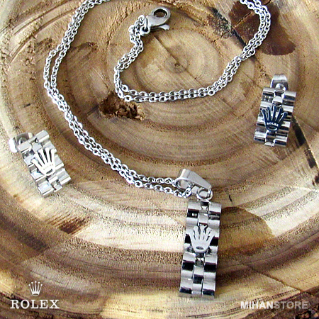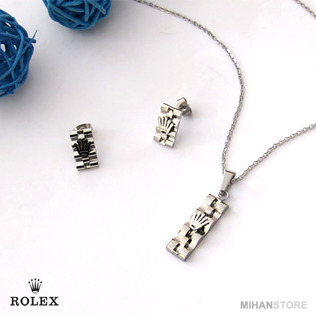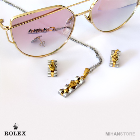 این نیم ست فوق العاده زیبا دارای گردنبندی با پلاک مستطیلی شکل فوق العاده کلاسیک است و به زیبایی به گردن شما آویخته می شود. گوشواره های این نیم ست نیز مستطیلی بوده و بر روی آنها و همچنین پلاک گردنبند نماد فوق العاده شیک برند معروف رولکس نقش بسته است. شما می توانید این نیم ست را در رنگ های طلایی، نقره ای و ترکیبی از طلایی و نقره ای تهیه نمایید.